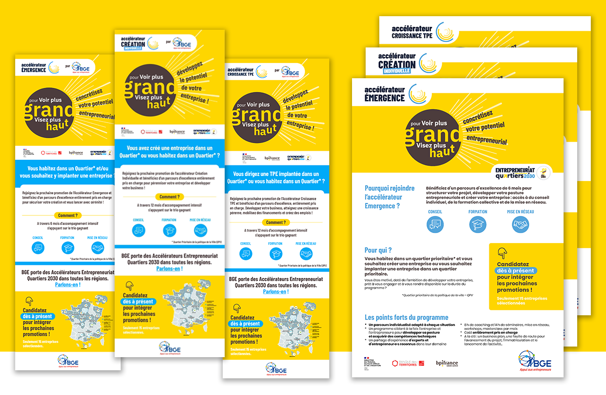 BGE, opérateur pour BPI France sur la partie Accélérateurs, a développé une identité et des outils pour promouvoir l’Accélérateur Croissance TPE, l’Accélérateur Création individuelle et l’Accélérateur Emergence.